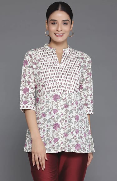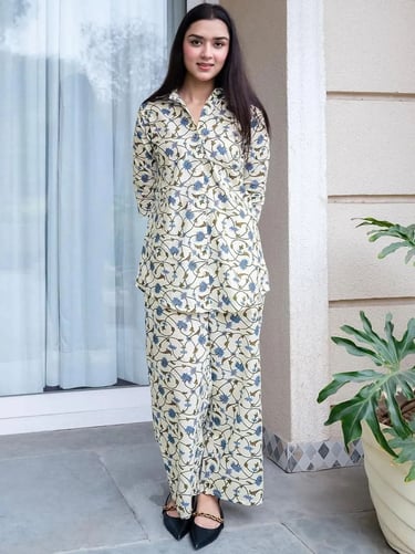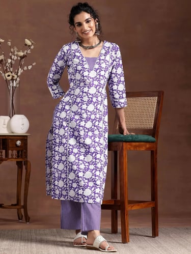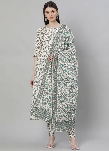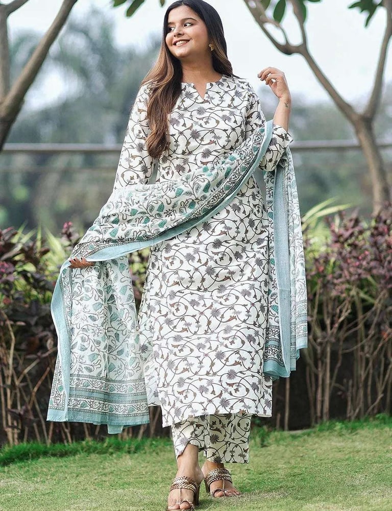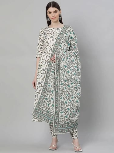 Our 3-piece white printed cotton suit set features a straight-fit floral print kurta with a notched neckline and three-quarter sleeves. Complemented with trousers with a partially elasticated waistband and roomy pockets, and a dupatta. Adorned with captivating floral print, this style is perfect for elevated everyday wear.