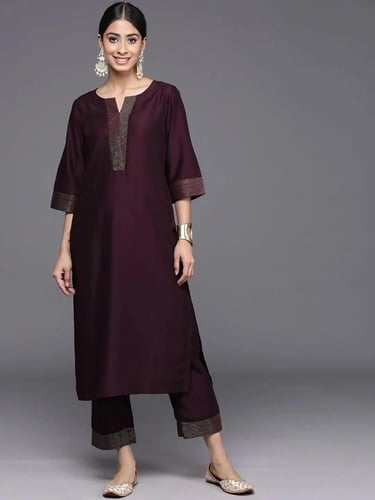 Our 2-piece burgundy solid-tone silk blend kurta set features a straight-fit kurta with a notched neckline and three-quarter flared sleeves. Complemented with trousers with a partially elasticated waistband and roomy pockets. Adorned with thread work, this style is perfect for work and beyond.