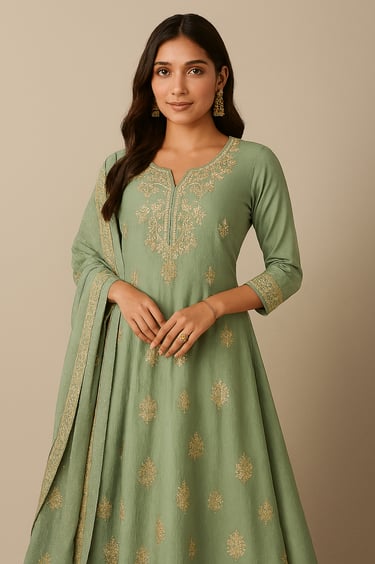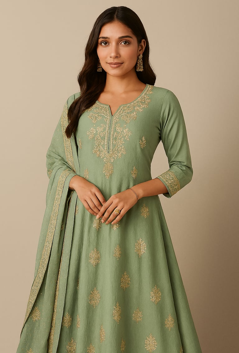 The sage green hue is calming and sophisticated, ideal for morning rituals and spiritual gatherings. Libas enhances this base with gold embroidery—delicate paisley and floral motifs that shimmer subtly in natural light. The V-shaped neckline and three-quarter sleeves are adorned with matching embroidery, while the flared skirt adds movement and charm.