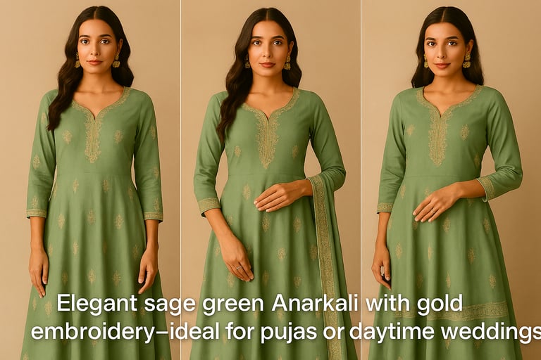 Sage green Anarkali with gold embroidery—styled for pujas and haldi functions.